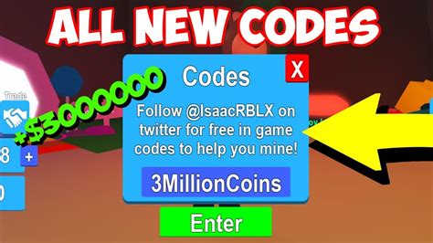 How To Redeem Mining Simulator Codes. Find Twitter word: Codes icon left side of the screen and click it. Type the code to opened tab and press Enter large green button. Then earn your free reward. More Roblox Codes